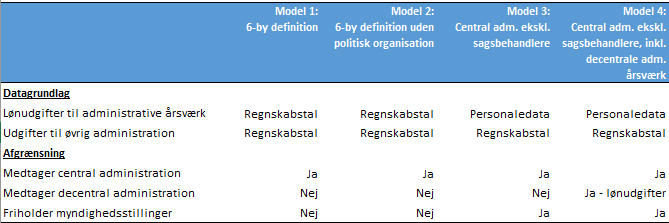 Økonomiforvaltningen har afdækket forskellige muligheder for at afgrænse administrative udgifter. Der er på den baggrund udarbejdet fire modeller med udgangspunkt i hhv. 6-by samarbejdets administrationsbegreb (model 1 og 2) og hhv. VIVE/Økonomi- og Indenrigsministeriets Benchmarkenheds administrationsbegreb (model 3 og 4):