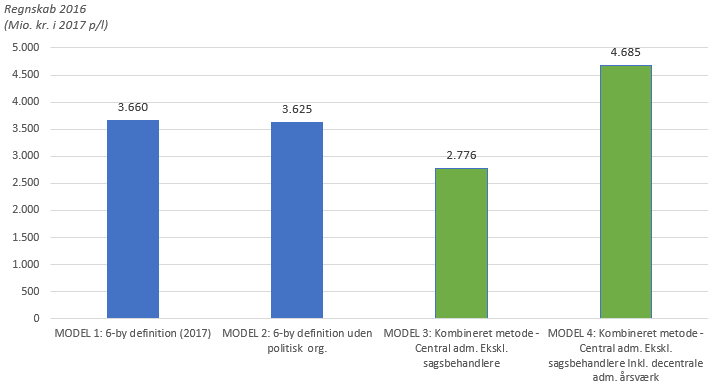 Med model 3 udelades lønudgifterne til sagsbehandlere, mens model 4 hertil medtager decentralt administrativt personale, jf. tabel 1.