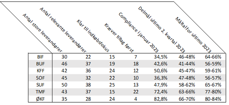 - Måltal for ultimo 2023: Den forventede andel af aftalecompliance der bør kunne opnås, når de to foregående punkter er implementeret, og der er opnået 95% aftalecompliance på de udvalgte leverandører.