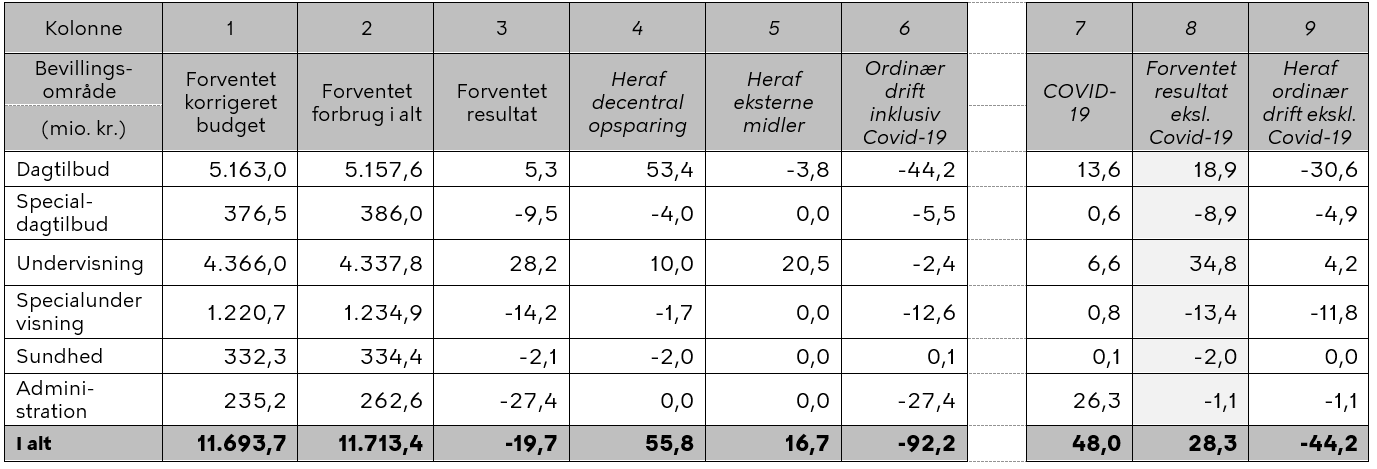 I tabel 1 ses forventningen til det samlede resultat ved 2. prognose. Samlet set forventes et mindreforbrug på 28,3 mio. kr. i 2022 ekskl. COVID-19 (tabellens kolonne 8) og dermed et budget i balance. Det er dermed forudsat, at der som tidligere kompenseres for COVID-19 udgifter på 48,0 mio. kr. (kolonne 7). Det forventes at ske i forbindelse med ØUs behandling af 2. prognose d. 24. august.