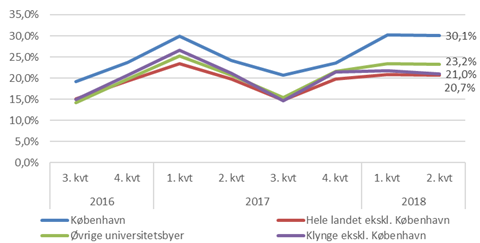 - Andelen af akademikere i København som får et virksomhedsrettet tilbud, er steget fra 20 pct. i 3. kvt. 2016 til 30 pct. i 2. kvt. 2018.