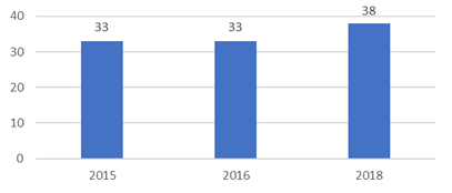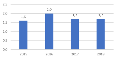 Figur 3: Udvikling i den typiske rejsetid (minutter), 2015 - 2018: