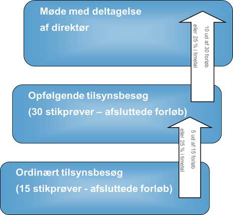 Dels indeholder forvaltningens tilsynskoncept objektive kriterier for, hvilket niveau af uoverensstemmelser ift. timeleverancer der udløser et opfølgende tilsynsbesøg hos en leverandør. Der gennemføres et opfølgende tilsynsbesøg, såfremt differencerne udgør mindst 25 pct. af de bestilte timer i stikprøven, eller der er differencer i mindst en tredjedel af de gennemgåede forløb. Såfremt fejlniveauet også ved det opfølgende besøg ligger for højt, kan der afholdes opfølgningsmøder med deltagelse af forvaltningens direktion. Denne procedure er ligeledes udmeldt til leverandørerne. Modellen er illustreret i nedenstående figur 1.