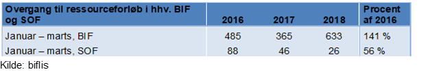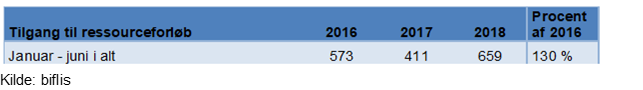 Data er hentet fra BIFLIS, der er forvaltningens ledelsesinformationssystem, for at kunne inddele ressourceforløbene i om borgeren har en koordinerende sagsbehandler i hhv. BIF eller SOF. Opgørelsen viser, hvor mange borgere rehabiliteringsteamet indstiller til ressourceforløb. Den reelle tilgang til ressourceforløb kan være lidt lavere, hvis borgeren eksempelvis fraflytter kommunen inden ressourceforløbet starter, eller hvis borgeren siger nej tak til ressourceforløbet.