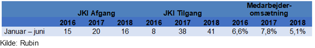 Medarbejderomsætningen på JKI er siden 2016 faldet fra 6,6 % til 5,1 % i 2018 i 1. og 2. kvartal. For hele forvaltningen er medarbejderomsætningen i samme periode i 2018 på 7,8%. Medarbejderomsætningen på JKI er således lavere end i forvaltningen som helhed. Opgørelsesmetoden tager højde for flytning af medarbejdere og for en stigning i medarbejderantallet.