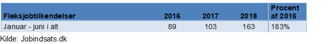Tabel 3 viser det antal borgere, der har fået tilkendt fleksjob i 1. og 2. kvartal i 2018, sammenlignet med samme periode i 2016 og 2017.