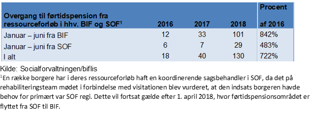 Af tabel 2 fremgår, hvor mange borgere, der forud for tilkendelsen af førtidspension har været i ressourceforløb i hhv. BIF eller SOF.