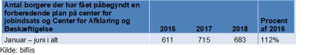I tabel 6 herunder ses, at det registrerede antal af påbegyndte forberedende planer er faldet sammenlignet med samme periode i 2017. Data på dette område afhænger af, at sagsbehandleren sætter en manuel markering, der er derfor en stor usikkerhed i forbindelse med antallet. Dette ses blandt andet ved, at det samlede antal af tilkendelser af hhv. ressourceforløb, fleksjob og førtidspension overstiger antallet af registrerede påbegyndte forberedende planer med ca. 40 %.