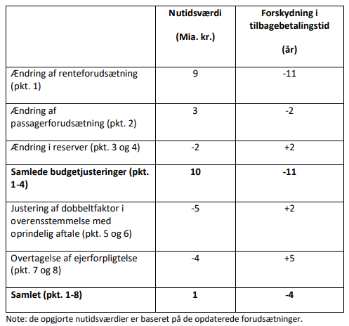 Af nedenstående tabel udarbejdet af Metroselskabet fremgår nutidsværdien af justeringerne og forskydning af tilbagebetalingstiden i Metroselskabets langtidsbudget: