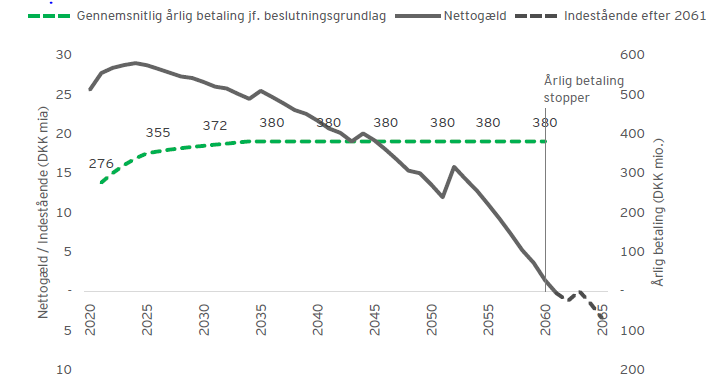 Justeringerne medfører samlet, at Metroselskabet forventes at have afviklet sin gæld i 2061, svarende til en forkortelse af tilbagebetalingstiden fra det gældende langtidsbudget med i alt 4 år, jf. nedenstående graf fra EY’s rapport (bilag 1, s. 10).