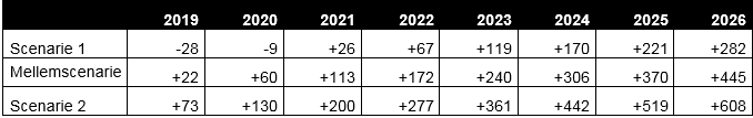 Selvom analysen viser, at der på kort sigt i bedste fald kan opstå mulighed for et mindre økonomisk råderum, så kræver dette, at ingen af de beskrevne risici i analysen realiseres. Såfremt risikotendenserne slår igennem, kan der være finansieringsudfordringer på op til 73 mio. kr. allerede i 2019 og 130 mio. kr. i 2020.