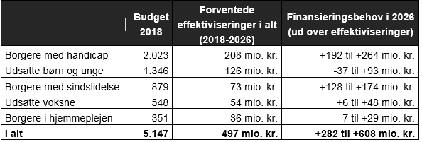 Tabel 2 sammenligner det det samlede finansieringsbehov i 2026 med de effektiviseringer, som forvaltningen skal realisere i samme periode. Som det ses af tabellen, forventes Socialforvaltningen samlet at skulle levere effektiviseringer på 497 mio. kr. i 2018-2026, svarende til 1,2 pct. årligt. Finansieringsbehovet på 282-608 mio. kr. i samme periode, som følger af stigende behov blandt forvaltningens målgrupper, er med andre ord en ekstra økonomisk udfordring af en størrelse, der kan vise sig at være på niveau med effektiviseringskravet til forvaltningen.