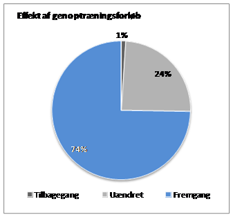 Figuren viser fordelingen af effekt blandt de borgere, der har afsluttet et forløb i 2017. Tre ud af fire oplever en positiv klinisk relevant fremgang og 1 ud af fire har en uforandret situation i forhold til at varetage de ønskede aktiviteter. Kun ganske få (1 %) oplever en tilbagegang.