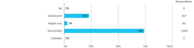 De 23 %, der blot står som ”distribueret”, er borgere, der har klikket på linket uden at udfylde noget i tilmeldingen. Man må antage, at en markant del af de 23 % har været ramt af KMD's udfordring med breve i e-boks. Det skal dog understreges, at man godt kan forvente, at en stor del af dem har fundet en anden vej til tilmeldingen igennem vores hjemmeside efterfølgende, da der kun er problemer med linket, hvis de tilgår det via e-boks. Dertil vises respondenter også som distribueret, hvis de har klikket på linket på vores hjemmeside uden at udfylde tilmeldingen, og her må man også antage, at der er en del.