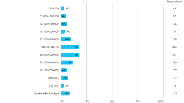 Størstedelen af vores borgerpanelsdeltagere har en indkomst på 300.000 og derover, hvoraf de 36 % ligger på en middelklasse/højere middelklasse indkomst på 300.000-500.000 kr. før skat om året. Gennemsnitslønnen på landsplan er på 294.000 kr. før skat om året, så borgerpanelets gennemsnitlige indkomst ligger over landsgennemsnittet. Se fordelingen nedenfor: