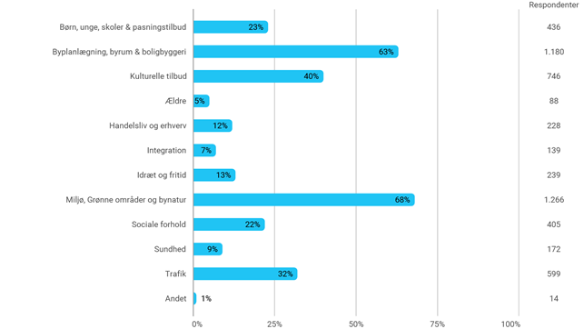 Hertil er der også hele 40 %, der vægter de kulturelle tilbud i bydelen højt. Ca. 1/5 af deltagerne synes, at sociale forhold er vigtige emner for dem. Borgerpanelsdeltagerne kunne vælge max 3 emner. Se fordelingen nedenfor: