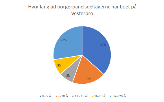 Der er relativt mange af borgerpanelsdeltagerne - 37 % - der er flyttet til Vesterbro indenfor de seneste 5 år . Omvendt er der også lidt over 1/4 af borgerpanelet der har boet på Vesterbro i over 20 år. Der kan ikke udregnes et egentligt troværdigt gennemsnit, da der er store værdimæssige udsving i tabellen. Se fordelingen nedenfor: