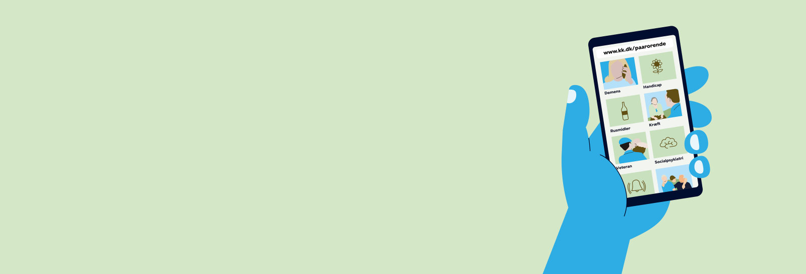Tilbud og støtte til pårørende Få overblik over Københavns Kommunes tilbud til pårørende, så du kan finde den rette støtte og vejledning. Du kan også kontakte Pårørendelinjen på telefon 51 64 90 30. For alle pårørende Pårørendekurser Kursus for voksne pårørende med langvarig sygdom tæt på livet. For alle pårørende Pårørendevejledning Vejledning, psykologsamtaler og viden til alle pårørende. For alle pårørende Livet som pårørende Få svar på typiske spørgsmål og se en film om hverdagen som pårørende. Kræft Pårørendegrupper, rådgivning, aktiviteter og samtaletilbud. Handicap Vejledning og tilbud til pårørende til en person med handicap. Hjerneskade Få støtte, aflastning og vejledning gennem Hjerneskadekoordinationen. Socialpsykiatrien Få hjælp til hverdagen som pårørende til en bruger af et tilbud i socialpsykiatrien. Demens Pårørendegrupper, rådgivning og samtaletilbud. Ekstremisme Viden og vejledning til dig, der er bekymret for en ung, du er tæt på. Diabetes og hjertesygdomme Find pårørendemøder og -grupper eller holdaktiviteter som madlavningskurser. Anbragte børn Støtte og vejledning, når dit barn er anbragt uden for hjemmet. Veteran Få vejledning og kontakt til en veterankoordinator. Rusmidler Tilbud til familier, børn, unge og voksne pårørende. Kriminelt miljø Støtte til pårørende til en person med tilknytning til et kriminelt miljø.