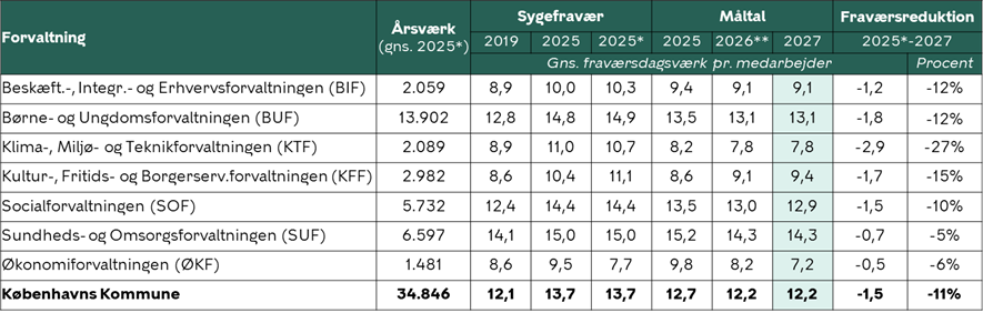 - at forslag til måltal for sygefravær for Københavns Kommune samlet set og pr. forvaltning for 2026 og 2027, jf. nedenstående figur og bilag 1, godkendes,