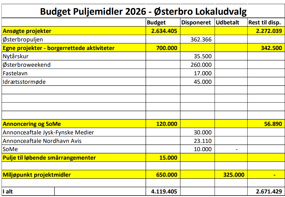 Sekretariatet har sammensat en status for det økonomiske forbrug for at give lokaludvalgets medlemmer et overblik over 2026-puljemidler. Oversigten giver et overblik over, hvad der er forbrugt/disponeret, og hvad der er tilbage til disposition inden for budgetåret 2026 for både ansøgte projekter (Østerbropuljen) og egne projekter.