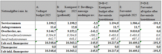 * Korrigeret budget godkendt (kolonne B) er gældende budget pr. primo september 2025, dvs. før korrektioner beskrevet i denne prognose. Der er redegjort nærmere for de bevillingsmæssige ændringer (kolonne C) i afsnit 2 om bevillingsmæssige ændringer. Den forventede afvigelse (kolonne F) er vist med negativt fortegn ved et merforbrug og uden fortegn ved et mindreforbrug.