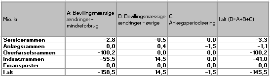 Tabel 2 viser de samlede forventede bevillingsmæssige ændringer til budgettet. De samlede korrektioner i kolonne D i tabel 2 svarer til kolonne C i tabel 1.