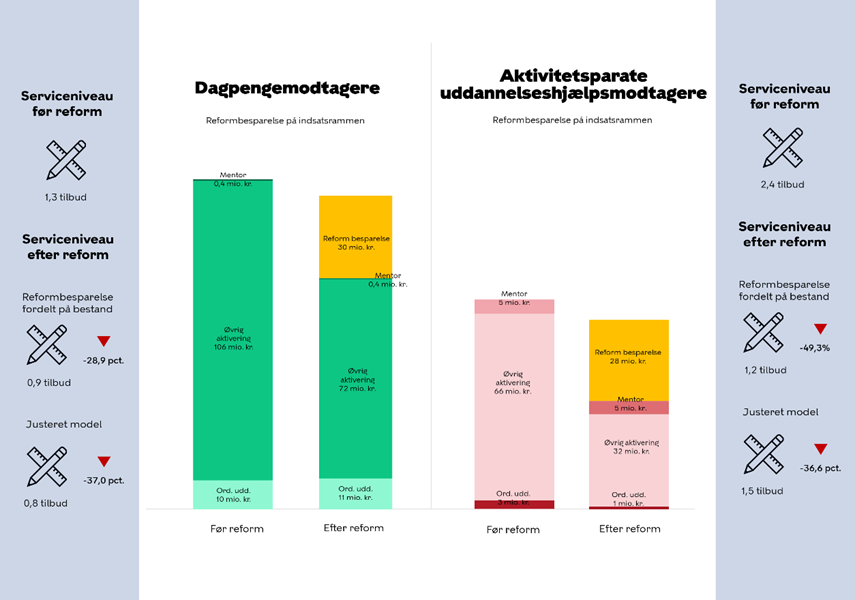 Med udgangspunkt i beskæftigelses- og integrationsudvalget tilkendegivelser på reformbesparelserne, har forvaltningen udarbejdet et forslag hvor 1/3 af besparelsen på indsatsrammen for aktivitetsparate uddannelseshjælpsmodtagere omfordeles til dagpengemodtagere. Valget af omfordeling skal ses i sammenhæng med de midler, der i forvejen tilføres til ungeområdet i form af Ungeløftet. Som konsekvens heraf vil antal tilbud per fuldtidsperson blandt de aktivitetsparate uddannelseshjælpsmodtagere – alt andet lige – falde til 1,5 tilbud fremfor 1,2 tilbud. Omvendt vil antal tilbud per fuldtidsperson blandt dagpengemodtagere – alt andet lige – falde til 0,8 fremfor 0,9 tilbud.