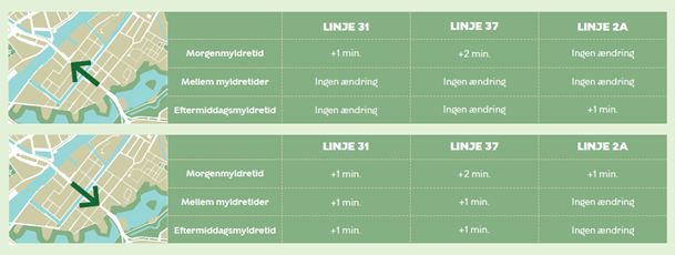 Movia vurderer, at det nye projekt kan medføre en forringelse af bussernes fremkommelighed på op til 2 minutter i morgenmyldretiden. De estimerede forringelser fremgår af nedenstående tabel.