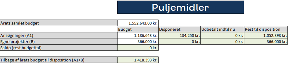 Der er 1.552.643,00 kr. i puljemidler til Kgs. Enghave Lokaludvalg. Der er afsat 1.186.643 kr. til puljeansøgninger i 2026. Indtil nu er der disponeret over 134.250 kr. til 5 eksterne puljeansøgninger.