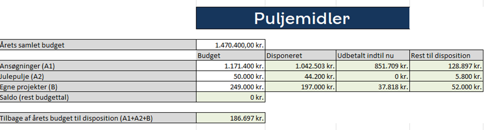 Der er reserveret 50.000 kr. til julepuljen, og ved senest møde i november blev det disponerede beløb reguleret til samlet 44.200 kr. fordelt på 4 julepuljeansøgninger (2 fuld støtte og 2 delvis), hvorfor 5.800 kr. tilbageføres Kgs. Enghavepuljen. Julepuljen er ikke en del af strukturen for 2026-puljemidlerne