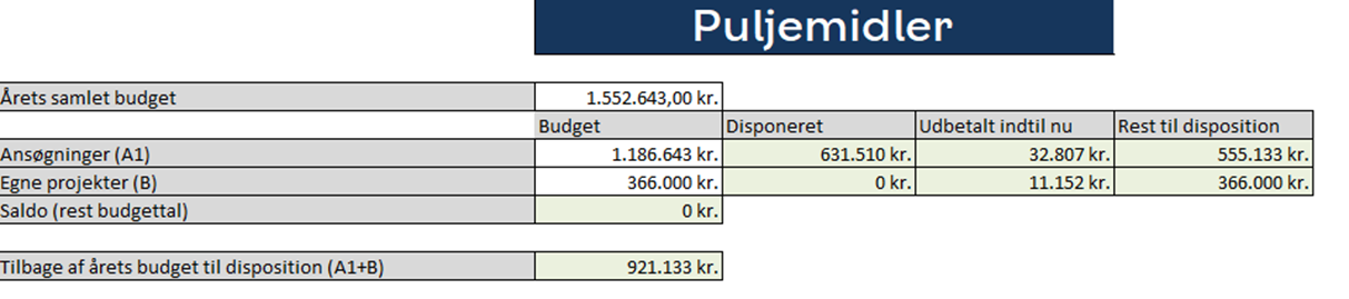 Mindst 148.300 kr. skal være tilbage i disponible midler fra 29. maj til 2026’s sidste officielle puljefrist d. 20. august og resten af året. Fristen d. 20. oktober er til eventuelle restmidler for 2026, men først og fremmest 2027-budgettets første officielle frist.
