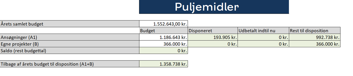 Det vil sige, at der er ca. 220.000 kr. i disponible midler for puljeudvalget de næste to måneder, da der skal være 297.000 kr. til disposition fordelt på de ansøgningsfristerne 20. april og 20. august.