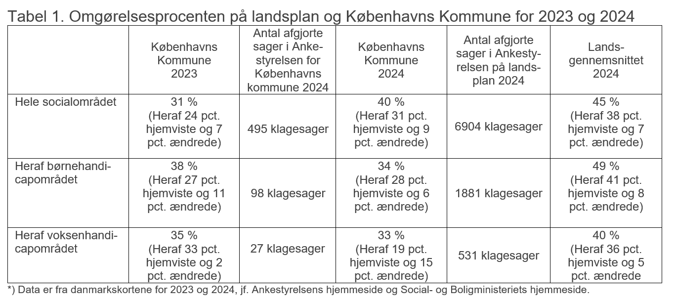 Ifølge danmarkskortet for 2024 er Københavns Kommunes omgørelsesprocent på socialområdet generelt på 40 pct., mens den er 34 pct. på børnehandicapområdet og 33 pct. på voksenhandicapområdet. Som det fremgår af tabel 1, ligger Københavns Kommunes omgørelsesprocent i 2024 på de tre kortområder under landsgennemsnittet.