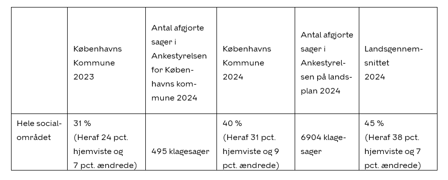 På ”socialområdet generelt” blev 198 sager omgjort i 2024 for hele Københavns Kommune. På ”socialområdet generelt” traf Sundheds- og Omsorgsforvaltningen afgørelser i alt 33.717 afgørelser. Det giver en omgørelsesprocent på 0,59% set i forhold til de antal sager Sundheds- og Omsorgsforvaltningen har truffet afgørelser i. Det er ikke muligt at generere tal for, hvor mange afgørelser Socialforvaltningen har truffet.