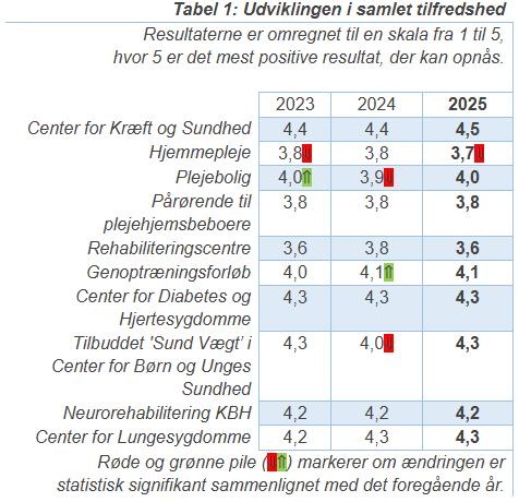 Tabel 1 viser udviklingen i den samlede tilfredshed fra 2023 til 2025.