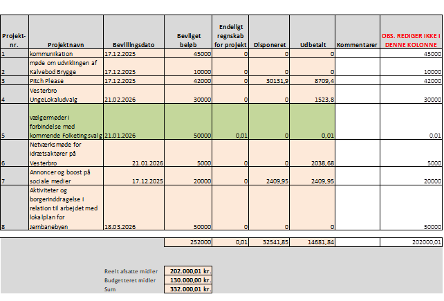 Nedenstående ses to oversigter, som egentlig er sekretariatets arbejdsredskab, til at holde styr på lokaludvalgets egne projekter. Derfor er oversigterne ikke formidlingsegnede, men bruges rundt omkring i lokaludvalgsarbejdet, til at give en status. Grønt Vesterbro, som også er et "Eget Projekt" har fået sit helt eget lille budget, men lokaludvalget kan se det som et projekt nr. 9. Projekt nr. 5 grønt og dermed færdiggjort i forhold til regnskab m.v.. Da der ikke blev afholdt vælgermøde, er pengene ført tilbage til puljen. De øvrige projekter er endnu ikke af forskellige årsager regnskabsafstemt. Det er den sidste kolonne hvor der står med rødt "OBS. REDIGER IKKE I DENNE KOLONNE" der er mest retvisende for status på de enkelte projekter. Dertil tallet ud fra "Sum" på 332.000 kr. som medtager Grønt Vesterbros budgetramme.