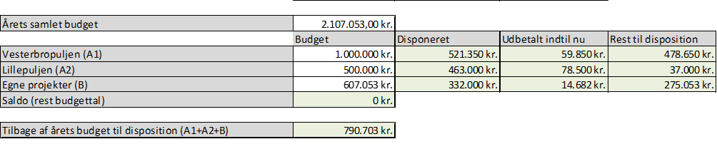 - Rest til disposition = de penge, I stadig kan dele ud. Det er: Det beløb, der er tilbage i puljen efter at der er taget højde for det, der allerede er disponeret.