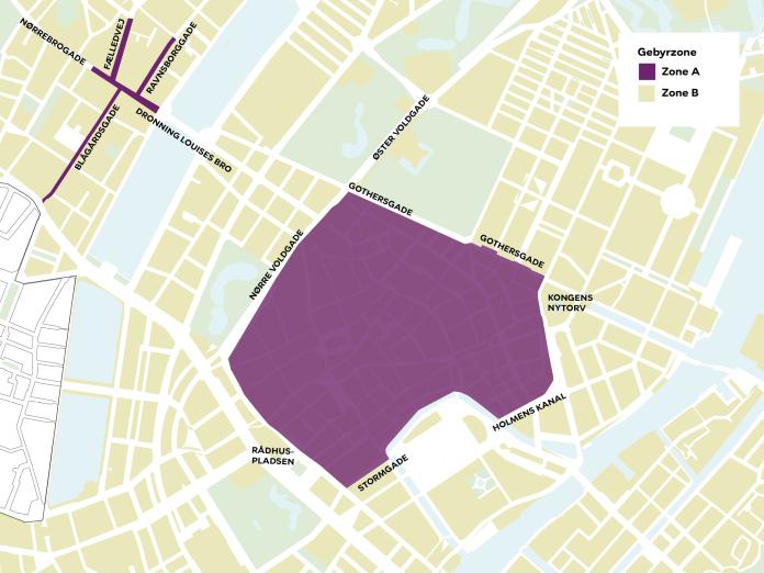 Gebyrzone A omfatter Middelalderbyen i Indre By afgrænset af gaderne Nørre Voldgade, Vester Voldgade, Stormgade, Nybrogade, Gammel Strand, Ved Stranden, Holmens Kanal, Kongens Nytorv og Gothersgade ind til Nørre Voldgade. For de nævnte gader gælder kun de husnumre, som vender ind mod Middelalderbyen med undtagelse af Gothersgade. Her gælder zonen også Gothersgade nr. 2-58 (herunder Boltens Gård).
