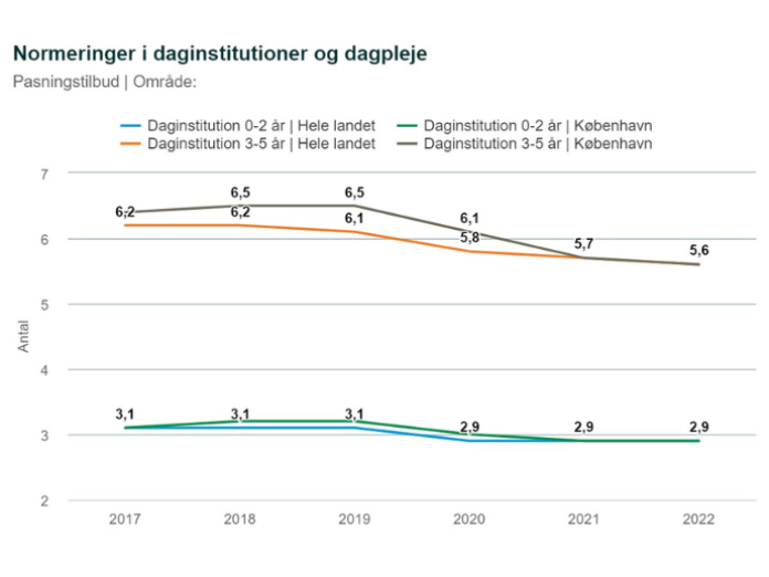 Københavns Kommune har indført bedre normeringer to år før resten af landet. Det vil sige, at fra 2022 har der i københavnske daginstitutioner i gennemsnit været 1 voksen pr. 3 børn i vuggestuer og 1 voksen pr. 6 børn i børnehaver målt over et år. Og de nye tal fra Danmarks Statistik viser, at København samlet set lever op til de højere krav for normeringer.