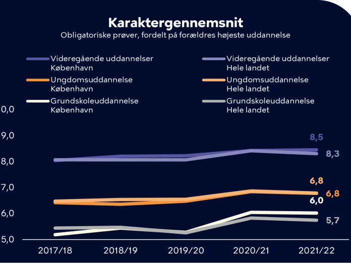 Tallene i nedenstående viser udvikling i karaktergennemsnittet fordelt på forældrenes uddannelse. Her skal der dog tages forbehold for, at afgangseksamen i hele landet var omfattet af ændrede regler pga. Corona de sidste tre år.