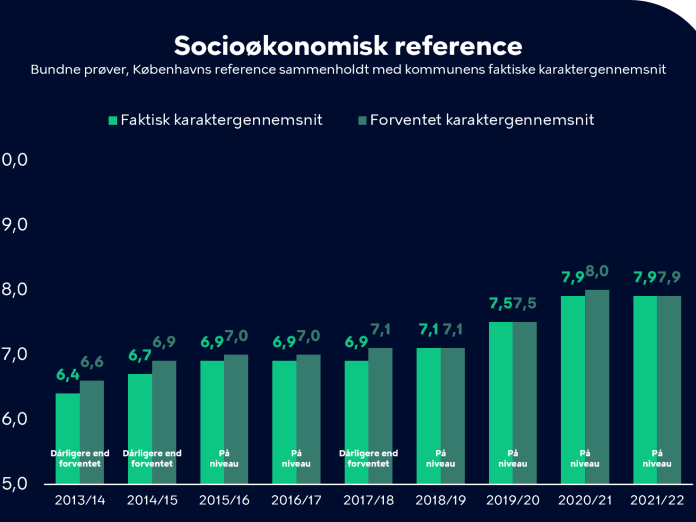 Her kan man se, at de københavnske folkeskoler har formået at hæve elevernes faglige niveau i forhold til forældrenes uddannelsesniveau – og det gælder både for elever, hvis forældre har en videregående uddannelse og for elever, hvor forældrenes højeste uddannelse er grundskolen. Med til fortællingen hører også, at karaktergennemsnittet for ikke-vestlige elever er steget.