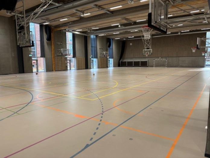 Hallen, der måler 20 x 40 meter, er indrettet med fokus på basket, klatring og indendørs atletik. De nye idrætsfaciliteter stod klar til brug i sommeren 2024.