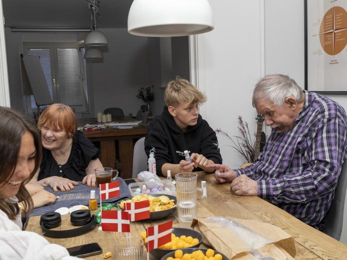 Fødselaren Dana spiller UNO med den frivillige Kristian og pædagogen Sofie Khusbu, da beboeren Nanna kommer og gerne vil være med. Alle byder hende velkommen og hun kommer med i næste slag UNO.