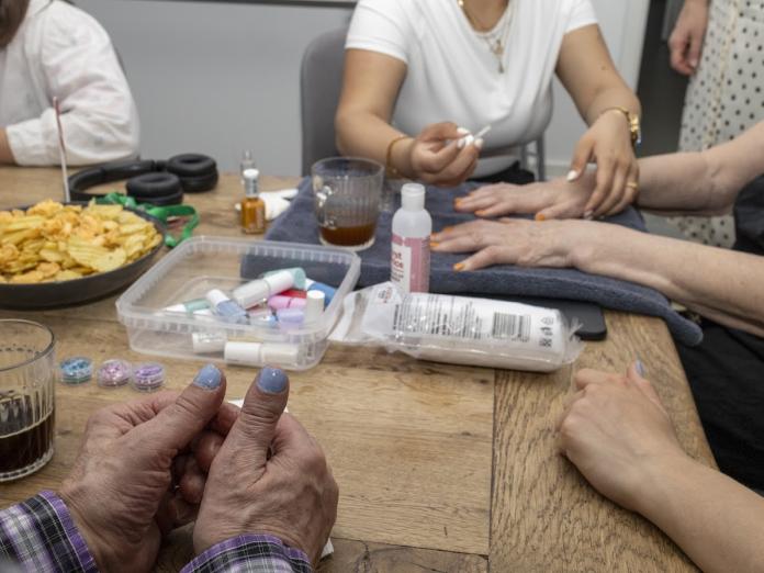 Inge har i dag valgt en orange neglelak og får sat små klistermærker på, mens Ole får lyseblå neglelak på begge tommelfingre. Da neglene er tørre, finder Manuelle papir og tusser frem. Hun har talt med borgerne om stort og småt under hele seancen.
