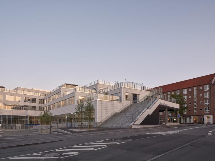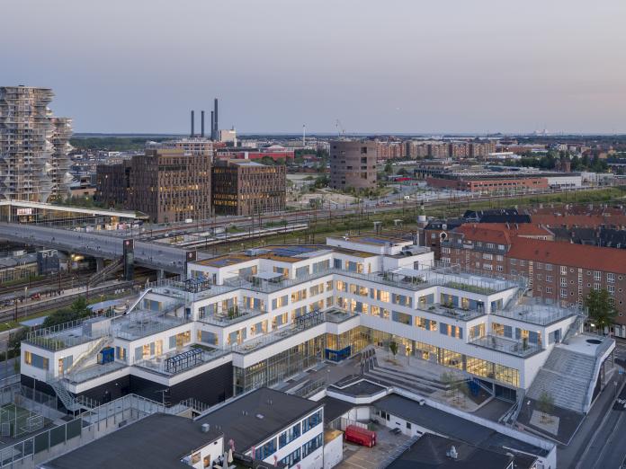Der er flotte kig ud over byen, både inde fra bygningen og udefra på tagterrasserne, og man bliver med sikkerhed et ægte bybarn ved dagligt at kunne betragte København på den måde, skolen faciliterer.