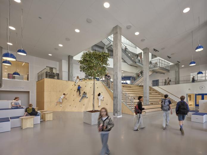 Man er lykkes med at få mange gode rumligheder ind på meget lidt plads. Både kantineområdet og fritidsordningen virker veldisponerede og behagelige at opholde sig i, ligesom de forskellige hjemmegruppeområder har en rolig og intim karakter. Idrætssalen er godt placeret i stueetagen, så den let kan anvendes uden for skolens åbningstid, og cykelkælderen er et forbilledligt eksempel på en cykelparkeringsløsning, som er funktionel og tryg, også for børnene.